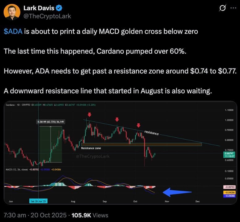 К Разумным ИнвестициямПо словам рыночного аналитика Ларка Дэвиса, дневной график $ADA вот-вот напечатает золотой крест MACD ниже нулевой линии. Это настройка, которая исторически знаменует собой начало крупного разворота тренда — или жестокую шутку от рыночных богов.